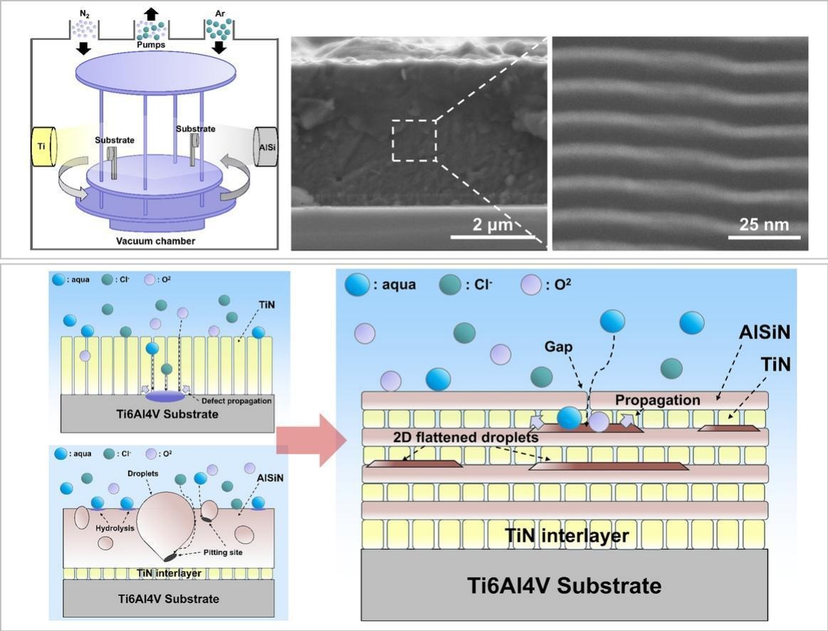 Defect-modulated nanolayered TiN/AlSiN coating with exceptional durability aganist marine corrosion