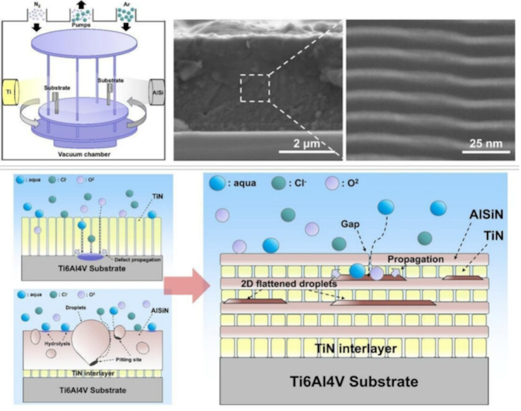 Defect-modulated nanolayered TiN/AlSiN coating with exceptional durability against marine corrosion.